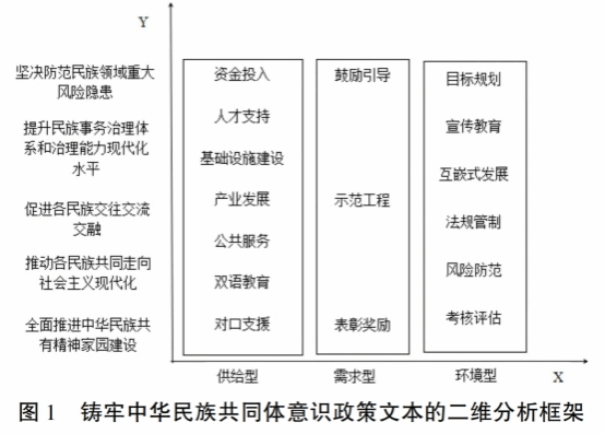 综合X、Y维度的具体内容,以基本政策工具为横向维度、政策任务为纵向维度,构建“政策工具—政策任务”二维分析框架(见图1)。其中,X维度标识了铸牢中华民族共同体意识的政策手段,Y维度呈现了铸牢中华民族共同体意识的政策任务体系。