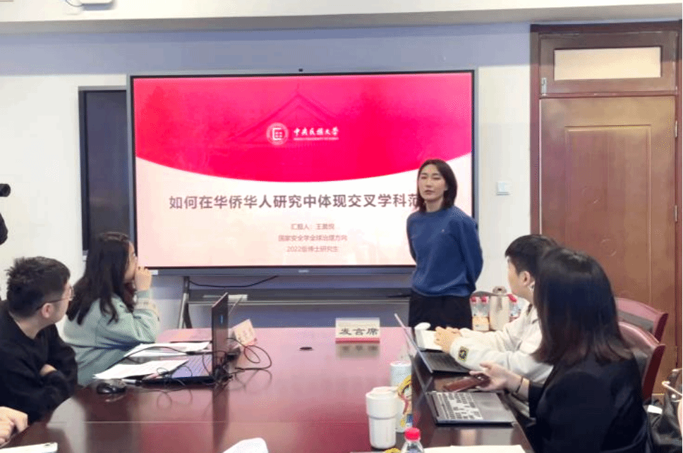2022 级全球治理专业博士研究生王晨悦对“如何在华侨华人研究中体现交叉学科范式”问题展开了分享,研究以自己在老挝为期一个半月的田野调查为基础,并在人类学、民族学等学科的交叉背景下探讨华人华侨在国家安全中发挥的相关作用。