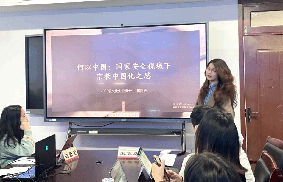 2023 级文化安全专业博士研究生黄丽娇在国家安全视域下进行了宗教中国化课题的相关探讨,分析了新形势下宗教中国化在研究范式和研究内容上需进行的转变,认为维护宗教文化安全是研究宗教中国化方向问题的应有之义。