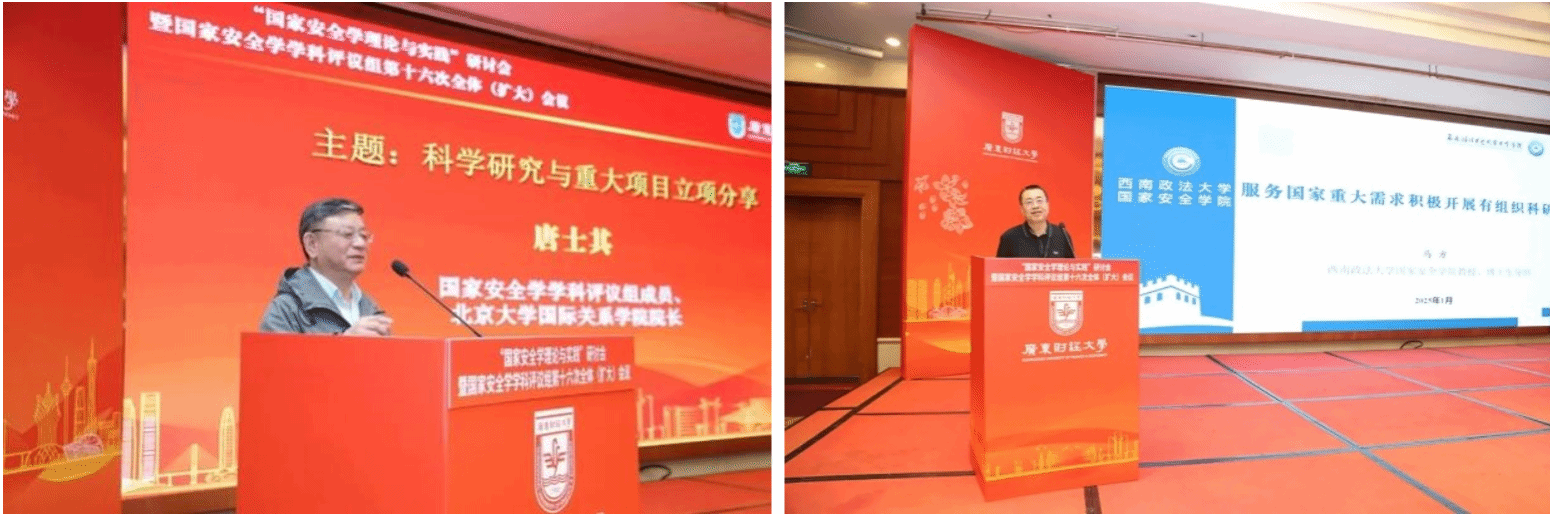 2025 年 1 月 4 日至 5 日,在《中华人民共和国学位法》正式施行的第四天,“国家安全学理论与实践” 研讨会暨国家安全学学科评议组第 16 次全体(扩大)会议于广州盛大召开。本次会议由国务院学位委员会国家安全学学科评议组主办,广东财经大学承办,吸引了来自清华大学、中国人民公安大学、中国现代国际关系研究院、国防大学、北京大学、中国人民大学、吉林大学、复旦大学、南京大学等 60 多家院校近 300 名专家学者参与,省市区有关部门负责同志也出席会议,共探国家安全学发展之路。我院执行院长李俊清教授和吴雪老师共同参加了此次会议。