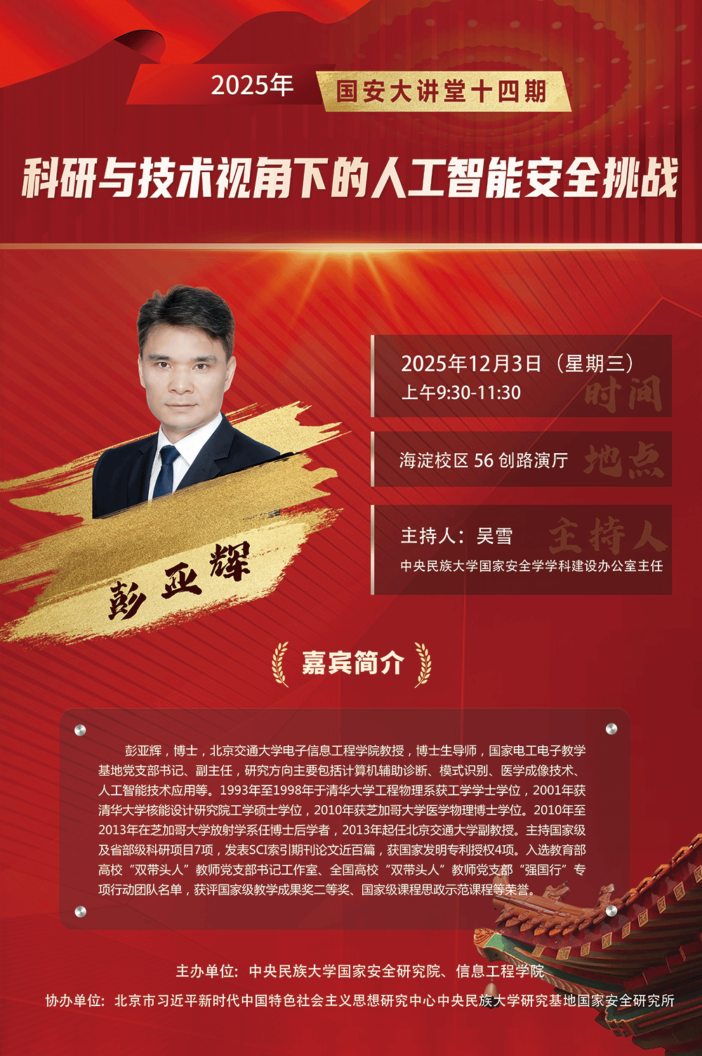 为国家安全与科技发展提供坚实支撑,构建兼具理论深度与实践效能的智能安全研究体系,调教小说 将于2025年12月3日举办“国安大讲堂”第十四期,具体安排如下: